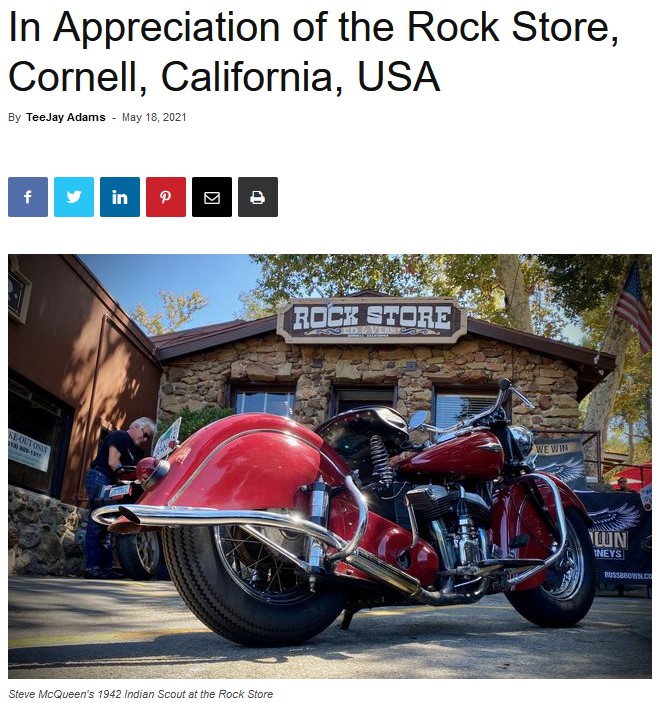 “…SoCal’s Rock Store, located on the famous Mulholland Highway, has the best of all worlds. Located between the tony seaside town of Malibu and LA’s valley area, the Rock Store is wonderfully linked to picturesque Pacific Coast Highway by a series of serpentine canyon roads that climb through the Santa Monica mountains. On any given weekend, the Rock Store’s parking lot is filled with interesting and exotic bikes, whether of the sport variety or the American V-Twin chopper crowd… So next time you’re in Southern California, do yourself a favor and take Latigo Canyon from PCH in Malibu up to Mulholland and the Rock Store. The ride up the tight and twisting Latigo, with panoramic views of the Pacific Ocean and hilltop mansions, is unforgettable, and the motorcycle eye candy at the Rock Store—especially on Sundays—rivals many bike shows.”